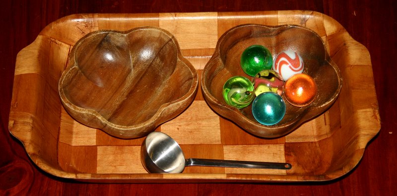 This was the first Montessori inspired activity I ever made. I presented it to my now 4 year old daughter when she was a toddler and she absolutely loved it. The large ladle was easy for her to manipulate successfully and the marbles were very attractive to her. She always completed this activity several times before putting it away and it was a favourite for some time. The marbles came from a $2.00 shop, the ladle from my kitchen junk drawer and the tray and wooden bowls from a Good Sammies recycled clothing shop. All up it probably cost me $5.00 and all the materials can be re-combined and used again with other activities. I would usually present it with the marbles in the left hand bowl to encourage left to right directionality in preparation for reading and writing.