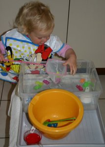 | shredded paper, packing beans | fishing pole (wooden pole with string tied to the end and a magnet tied on the end of the string.) Cut fish shapes out of card and glue a paper clip to the nose of each. Write numbers, letters, sight words or whatever you are working on onto each fish and have child name them as they are caught. If they cannot recognise the letter etc. toss the fish back and catch again later. Do not work on too many new letters or numbers etc. at a time – ensure most catches are successfully named!