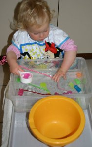 For water play (as in the photo above) I have a smaller crate that I fill with water and a very shallow tray that goes underneath. This gives me a dry area for the accessories that are not in use and somewhere to put muffin trays for sorting and other activities near the water tub. For dry activities like pasta, the accessories can be kept in the large tray with the pasta and just put to one side.