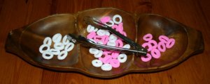 Tonging is easily adapted to many other concepts, particularly mathematical skills. Beginning sorting with two simple categories is an easy way to combine the skill of tonging with a more challenging task for older toddlers and preschoolers. In the photo above, children sort the hair elastics into 2 separate colour piles; the first step along in learning the concept of sorting by colour.