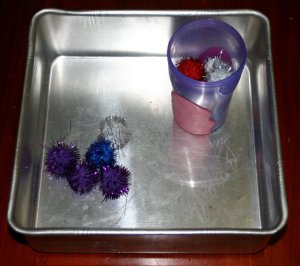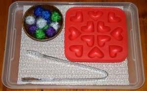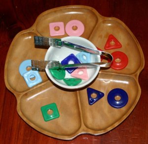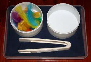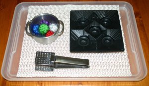 Tonging activities link in well with other skills such as one-to-one correspondence. Plastic iceblock trays, egg cartons, chocolate trays or any other container with an obvious number of holes are ideal for this. Simply put, the child has to place one item in one hole. If there are any left over, or they run out before all the holes are filled, they are prompted by the empty space or left-over pieces to self-correct their work.