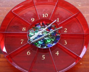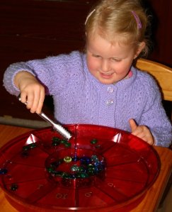 Linking tonging to counting is fun for the preschooler and provides valuable practice of fine motor skills. Here the child tongs the correct amount of jewels into each segment of the dip plate. My 3 year old is pictured doing this activity in the photo at the top of this post. The counting side of things wasn’t too difficult for her to do even early on, but it was a test of her endurance and concentration skills to persevere with the tongs to complete all 10 segments.