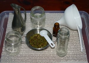Adding funnels to a dry pouring activity adds yet another dimension and when I have had simple pouring activities available for quite a while, I set up a combined scooping, pouring and funnelling tray for a  more complicated experience. After I have changed this around for a while, I then add teddies and other small animals or toys and turn it into more of a pretend play type activity. This allows a broader scope of play and promotes longer engagement by older toddlers and preschoolers.