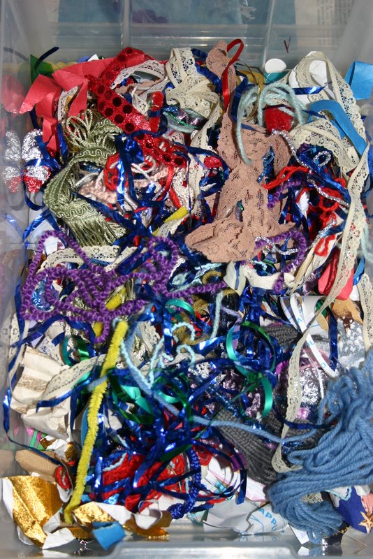 They seemed to have a bizzare attraction to the jumbled assortment of goodies and enjoyed the gluing just as much as when presented with my neatly sorted dip tray. Consequently, we now have both. When the dip tray gets jumbled and messy, I simply tip it all into a small crate with a lid and re-fill the compartments in the dip tray with new materials. That way both collections are continually changing.
