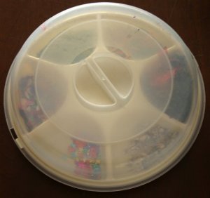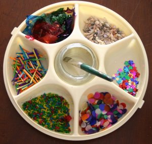 One of the easiest ways to keep collage materials sorted and ready for gluing  is a party dip platter like the one in the photo above. The compartments hold a number of different materials for children to choose from and the lid slots on over the top and seals with a turn to stop all those bits and pieces ending up on the floor.