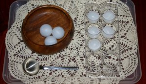 Egg cartons are a cheap and readily accessible option with clear depressions for each object. A large object to transfer such as these stones or wooden eggs will keep a toddler well occupied.