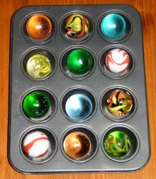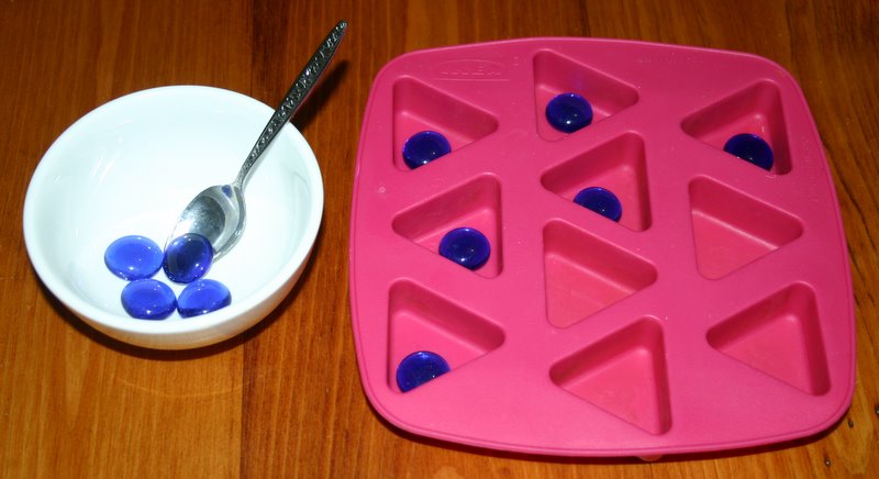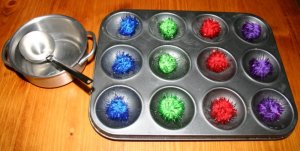 These super sized marbles are a favourite material in our house, even for the older children. They fit perfectly into this mini-muffin tray.