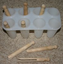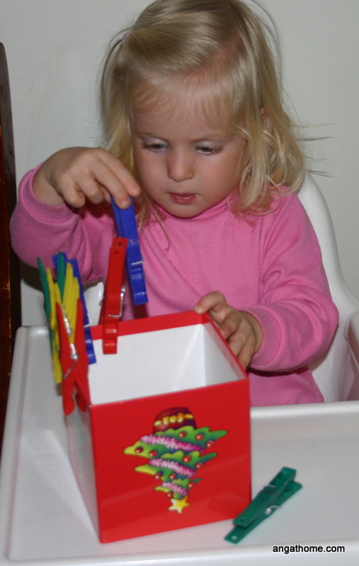 Popsicle tray and wooden dolly pegs. It’s surprising how something this simple can hold a young child’s attention.