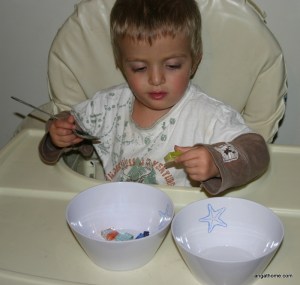 Another transferring activity. I tried several kinds of tongs for transfer but my son was very frustrated by them, finding them too difficult to use. I decided to leave them for him for a while and let him enjoy transferring with spoons and scoops. His pencil grip is perfect so I am not too worried about his fine motor skills at this stage!