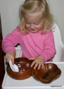 I have done tray activities in the traditional Montessori style before (on a piece of carpet to designate a work space) but I find it easier at this age and with two at a time to keep them in their highchairs. This means I can use the time to prepare or clean up a meal or any other task and flit in and out of the room while they work on their activities without coming back in to find 5 trays up-ended on the floor at once! It also helps them to concentrate on the task at hand and learn to fully complete each activity before starting a new one. Concentration time is extended as they learn to stay focussed until I am ready to change the materials for them.
