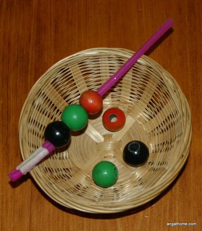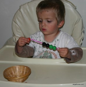 This bead threading activity was the favourite of the lot and both twins want to do this again and again. They do enjoy chewing the straw though so I have had to replace it several times. Luckily this takes only a matter of seconds to do – see below.