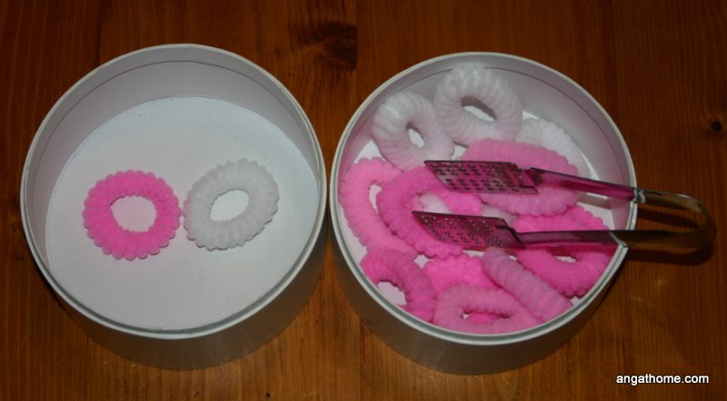 A simple tong transfer practical life activity. I found a huge packet of large hair lackies at the $2 shop and they are great for beginning tong transfer because they are so easy to pick up.