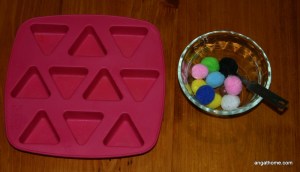 One to one correspondence is an important pre-number mathematics skill. In this activity, preschoolers scoop one pompom into each depression in the iceblock tray.