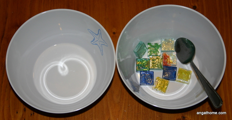 Jewels, rocks and other decorations that are used for potplants and vases make excellent Montessori materials. They are very attractive to children of all ages and even my older children love to use these for maths manipulatives. This is a simple scooping transfer activity from one bowl to another.