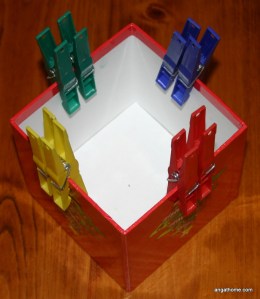 Providing a four sided container and pegs in four colours quickly turns this into a colour sorting activity. If you added some coloured sticky dots in the same colours as the pegs then younger children can begin to match the colours by pegging each peg onto the corresponding coloured dot.