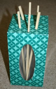 A set of plastic chopsticks has been used in many different ways over the years in my house. Another small spaces activity; poking them into the holes in the side of this tissue box
