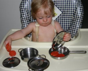 Here are a few ideas for home-made or readily available activities you can give to an older baby or young toddler during times where they are required to stay in a set boundary and play with the toys you have supplied (e.g. mat time (blanket time), room time, playpen time, highchair time and table time.)
