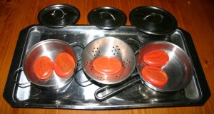 This very large bottle is a great posting container. Pegs, popsticks or any other thin object can be pushed through the lid hole and pulled back out through the open slot in the front. The edges are taped where they were cut to cover the sharp edges. I originally saw this used as a water pouring activity with a funnel in the spout and a large flat tray underneath to catch spills. The children were scooping the water out from the large front hole and tipping it back into the funnel at the top.