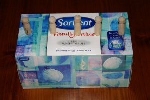 Even quite young babies will enjoy pulling these dolly pegs out of the holes in the tissue box and carefully inserting them back in again. If they are pushed all the way in, the hole on the bottom of the box allows the child to pull the peg out from underneath. Posting and small spaces activities are great for developing fine motor control.
