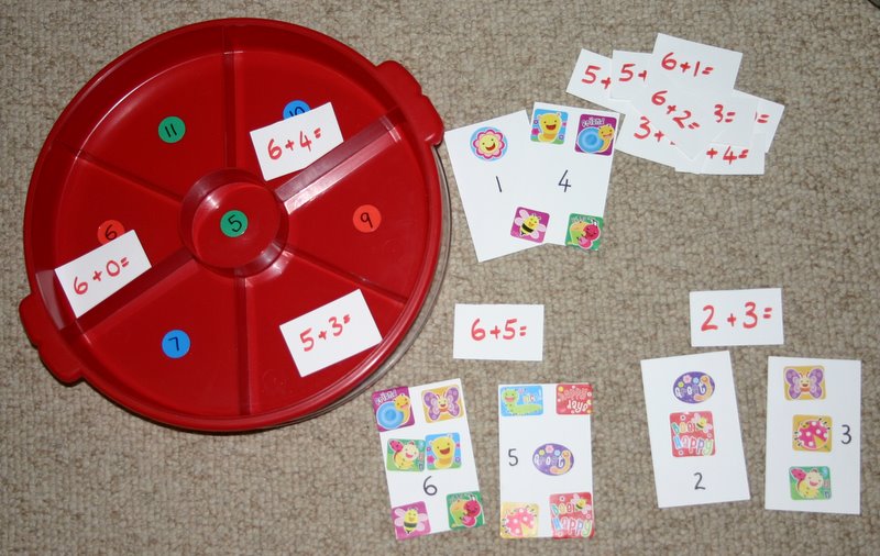 peg & pompom paper plate addition to 10These pegs are labelled with the addition facts and the pompoms serve as the counting material. Once the child has found the answer, the peg is clipped onto the correct segment of the paper plate. It is self-checking as there is only one peg for each segment – any double-ups means that they need to redo those pegs to discover the correct answer. The holder for the pegs is the centre from a used roll of masking tape.cutlery noodle additionThis was a favourite with my children. As always, making up a funny story to go with the activity turned it into something really fun. Those greedy restaurant patrons were at it again and the children had to figure out who’s cutlery was whose and put it into the correct cup. Only one knife, spoon and fork should be in each cup, so again, any double-up means that the child needs to redo the problem. The noodles serve as the counting material.sticker addition red sort trayThis activity is very quick to make. The sticker cards are the manipulatives with problems written onto card strips. Once solved, each strip is placed into the segmented dip tray in top of it’s answer. peg addition black 4 hole trayNumber stickers on the base of the 4 segment tray determine where each problem card is placed. The pegs are slipped onto the sides to count and solve the problem.gold & silver start additionThe silver stars have the problem and the gold stars hold the answers. The child counts the jewels to solve the addition sum and matches the silver star to it’s mate.