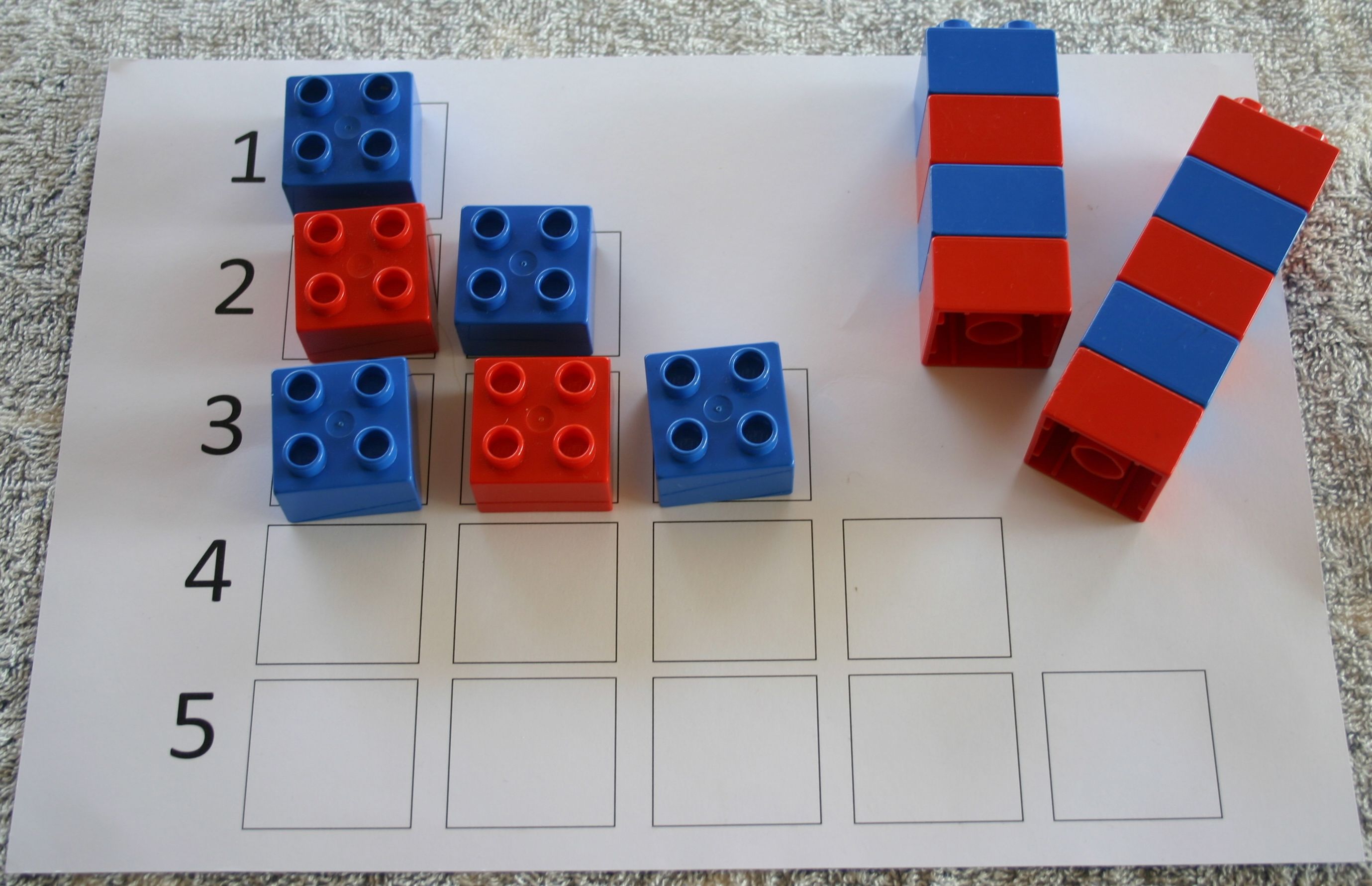 The 3 year olds have been learning how to recognise the numerals 1 to 5 and count small items. Combining building with Duplo as well makes this counting tray attractive, particularly to boys.