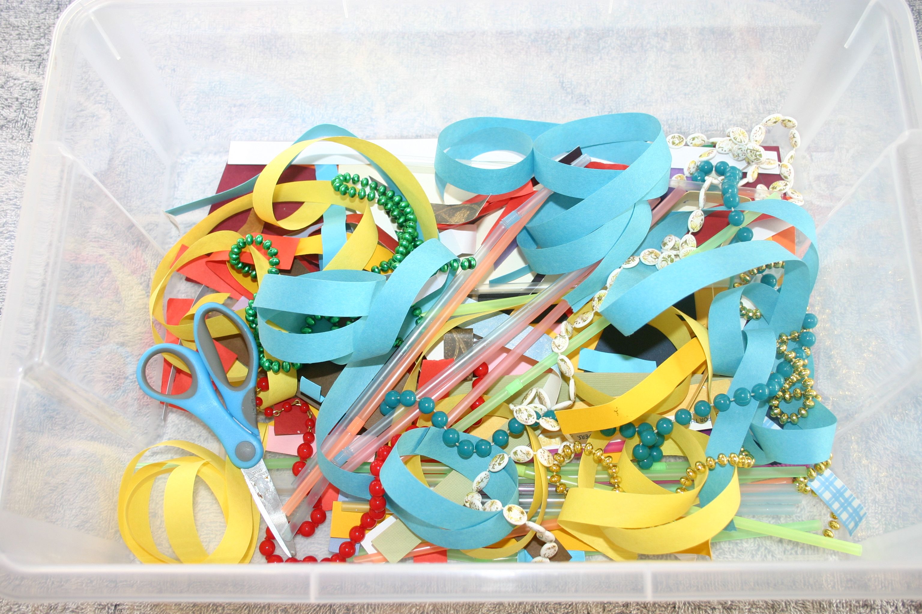 Teaching toddlers to cut provides them with an absorbing activity that is great for their fine motor skills. The twins have had experience with all the materials in this box so this is just an assortment to chop up any old way they like. Paper streamers, card strips, beads, straws and other oddments such as tinsel or curling ribbon could be included. We let the bits fall back into the box and they can eventually be used for collage later on. The cutting box with free printable patterns I prepared a little while back was too advanced for them so I have put it away to use later on.