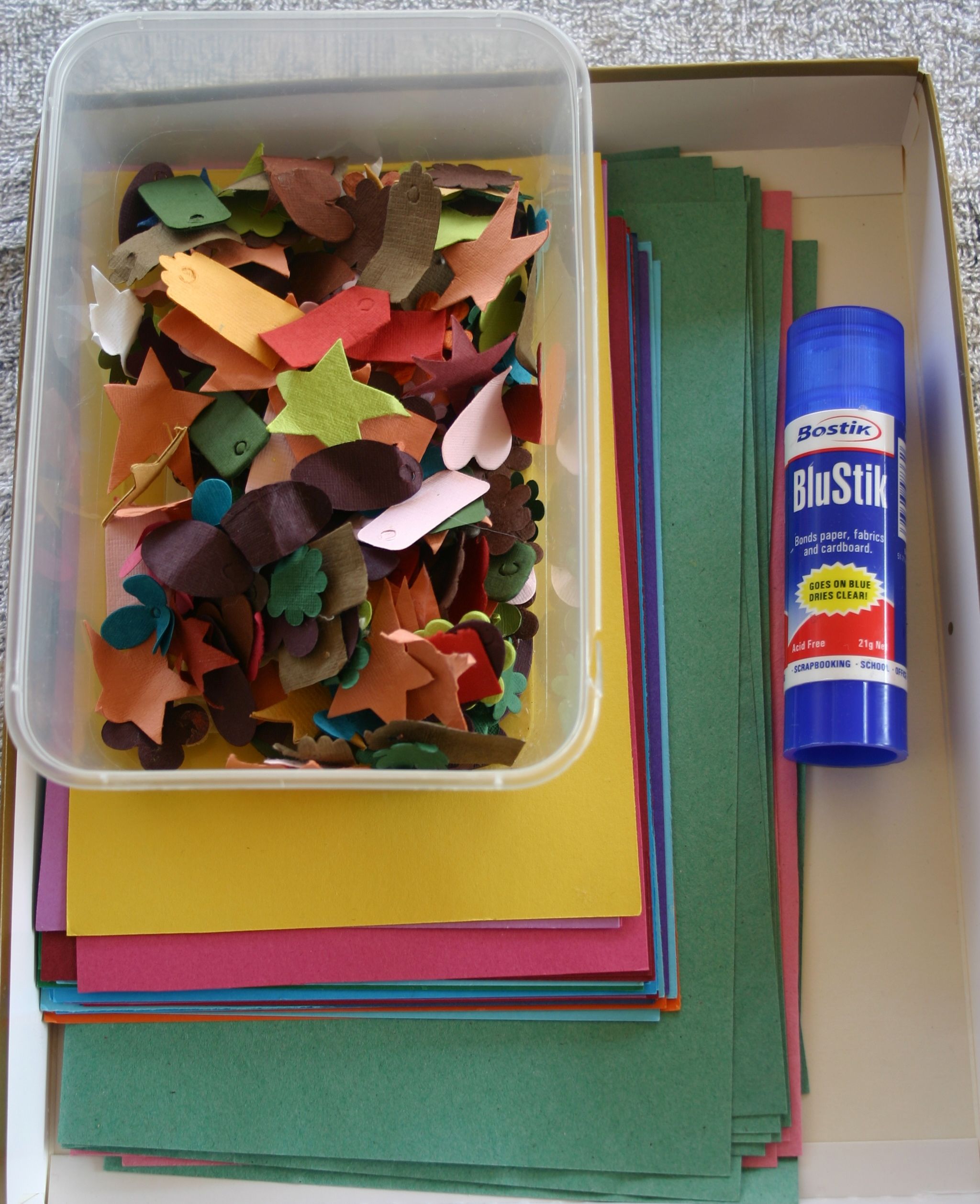 Teaching toddlers to glue is another open-ended activity that they will love. Using a glue stick makes it a lot less messy to begin with. A selection of coloured card pieces and diecut shapes from a Kmart scrapbooking assortment pack made this very easy to prepare.