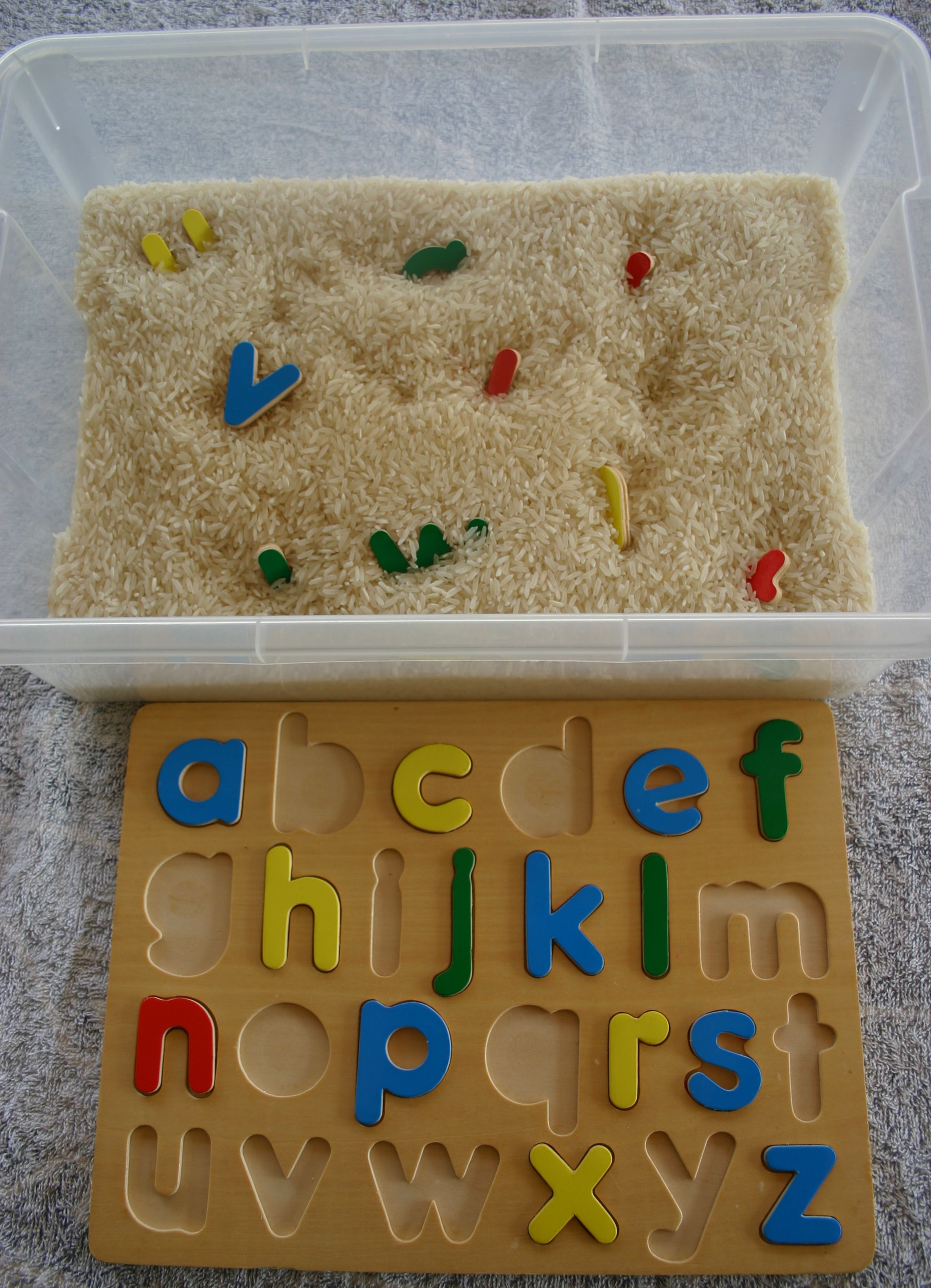 Sensory tubs have so many applications. Finding puzzles pieces hidden in rice is pictured above. See here for many more ideas.