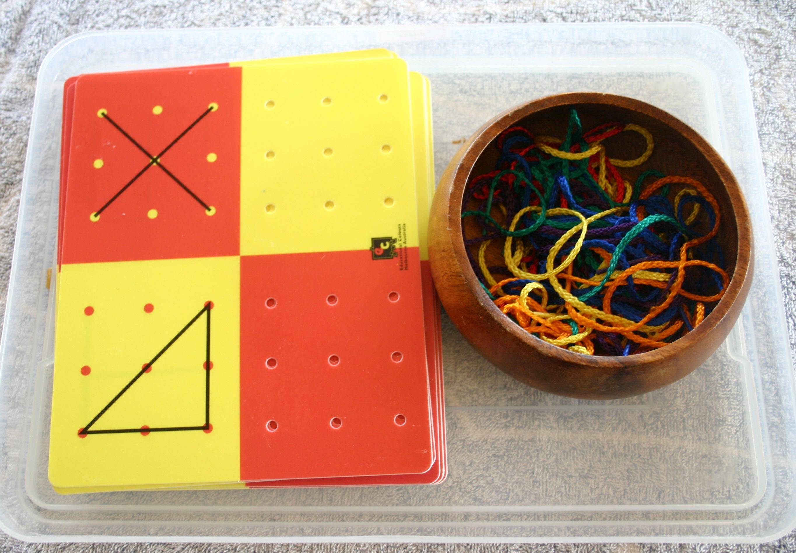 Sewing and lacing cards. These have a shape drawn for the children to copy. There are plenty of sewing and lacing shapes around to buy or make your own by punching holes around a cardboard picture using a hole punch.