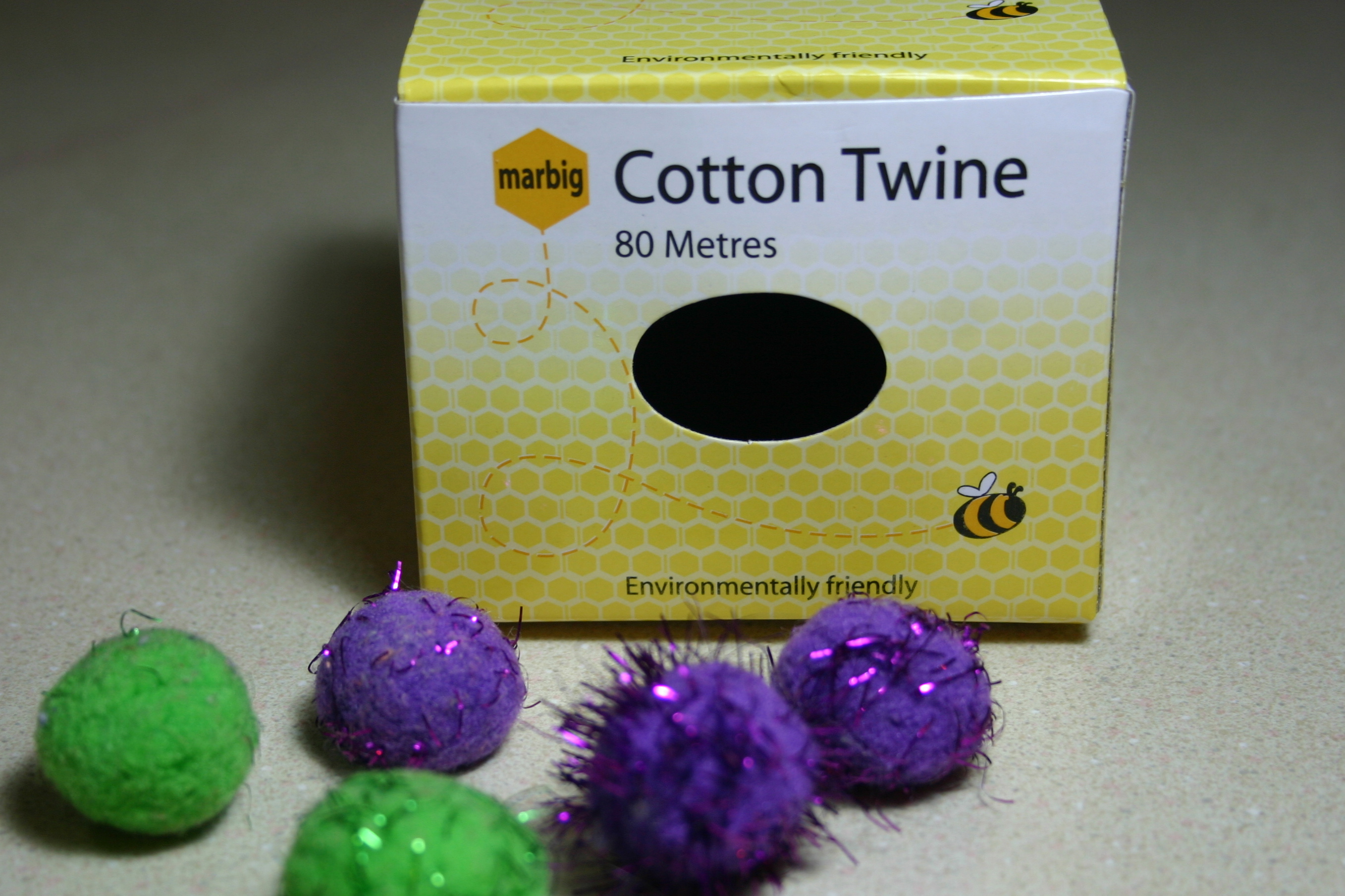 Posting box: Pushing pompoms into the hole in this twine box. Help is needed to open the box to tip them out again but as we are sitting right next to him this is not a problem.