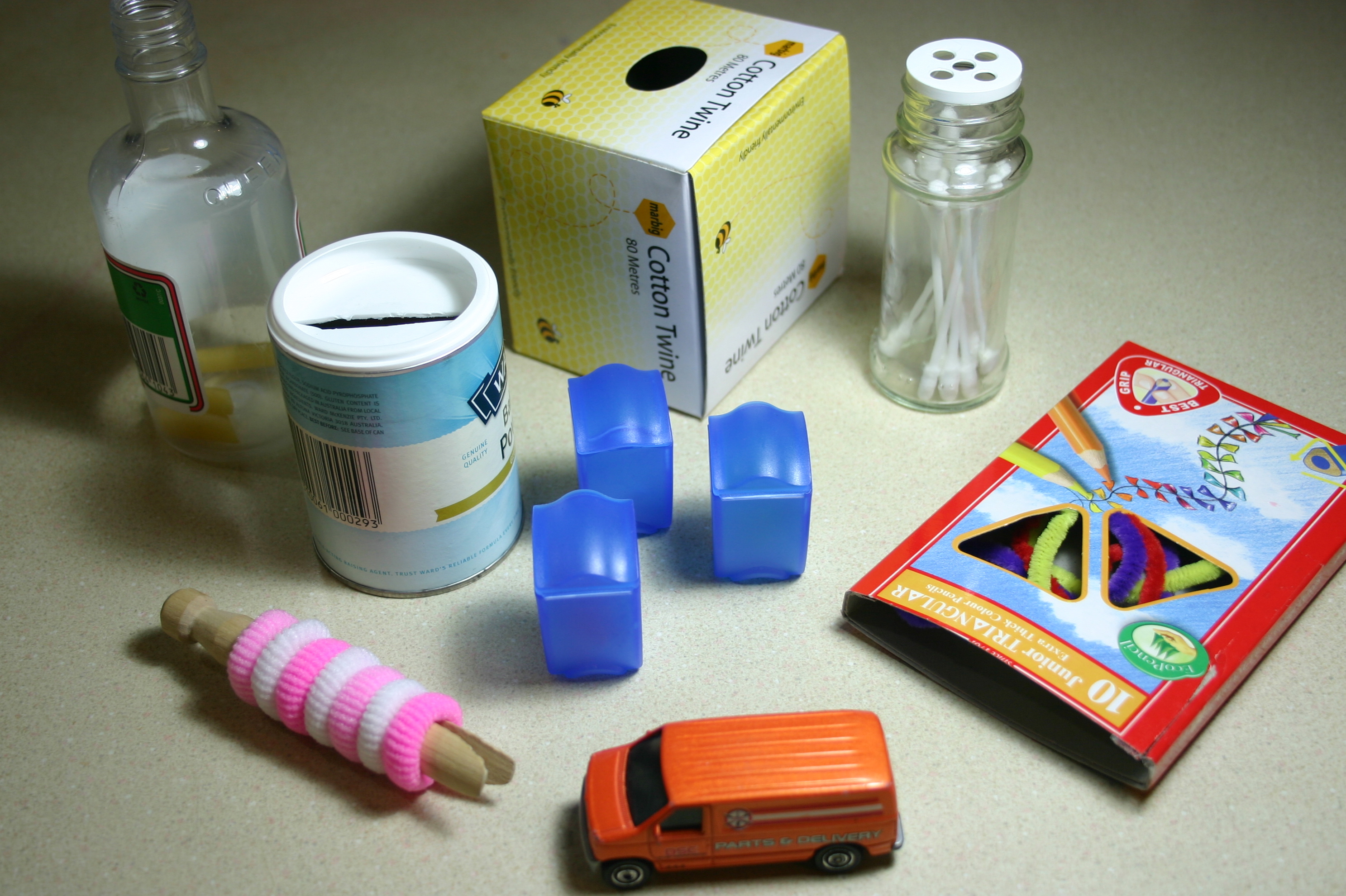Spend a little time preparing some new and interesting activities that are kept aside for use while you are out. Either purchased toys and books or some simple (and cheap) home-made ideas like the ones that follow. Toddler’s generally do not have a well-developed imagination and tire of toys that don’t “do” something relatively quickly, so having to buy new things continually to keep up with their changing developmental needs and interest can become very expensive. These home-made toys are great for developing fine motor skills and hand-eye coordination and when introduced at the right developmental level, will be stimulating and interesting for your young child. If a task is too easy it will not hold their interest. Too hard and they will become frustrated and lose interest.
