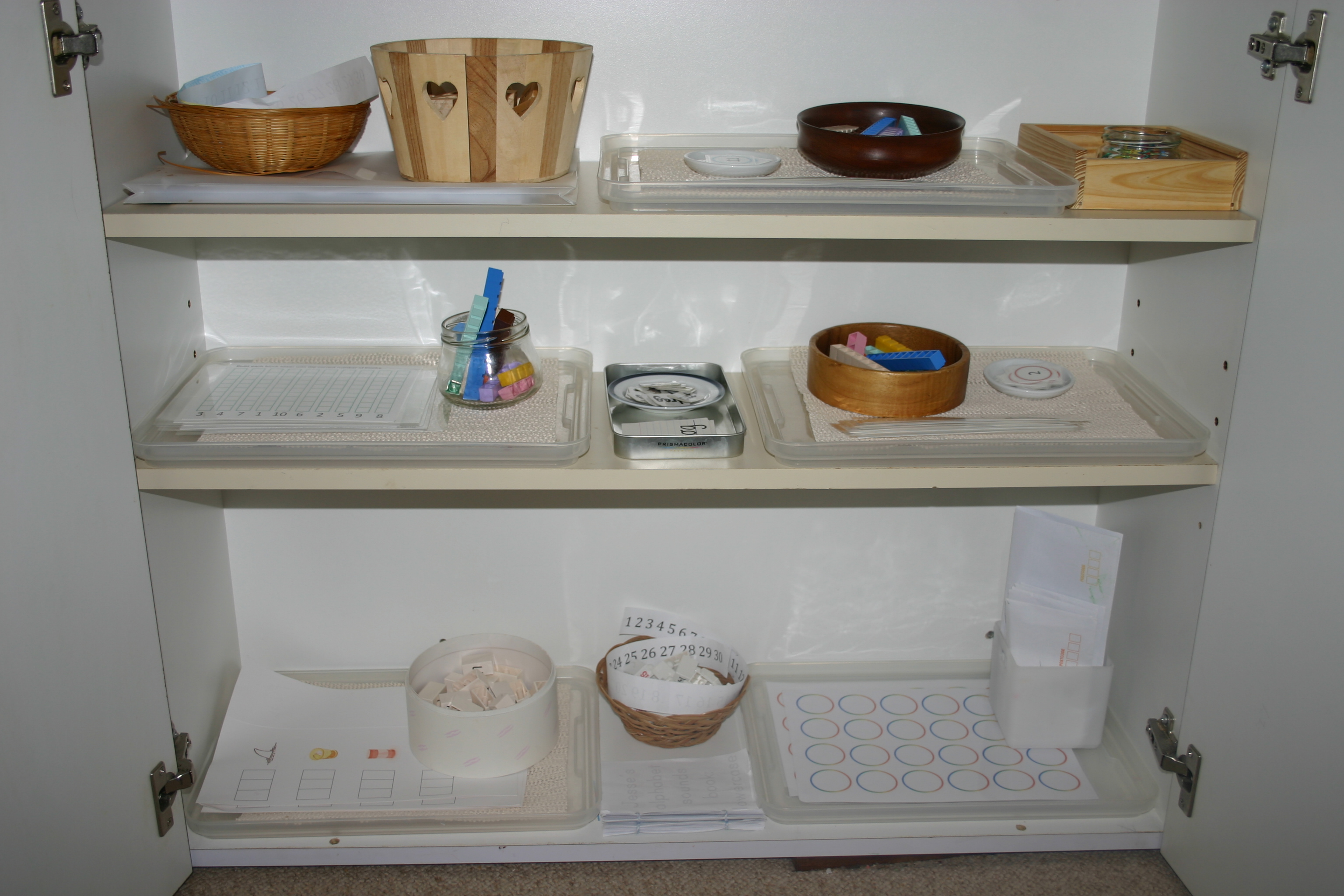 It was time for an update of the activities available for my preschoolers this week. This cupboard is only used for “school” time with Mummy once a day by the twins (4 years) and contains our more formalised school activities – number and letter work etc. (Last months activities are here.) We are making the most of the next 2 months before baby number 7 is due to work on preschool skills. Once bub arrives these activities will be changed to more play based choices and able to be used independently, rather than requiring my direct supervision. Please keep in mind that I am not suggesting all 4 year olds are ready for this level of work. I work steadily with my children, moving ahead as far as their understanding and development allows. I do not stick to teaching skills by grade or age, but rather follow each child’s development as far as they are able. This changes from child to child and the ideas here are more traditionally at pre-primary to year 1 school level. It is more important that children learn to sit and concentrate, follow instructions, learn Godly character etc. than a list of rote learning or academic skills. The twins happen to be able to cope with these activities and show an interest in them so I will go with that for now. If it becomes burdensome and onerous for them, we will take a break.