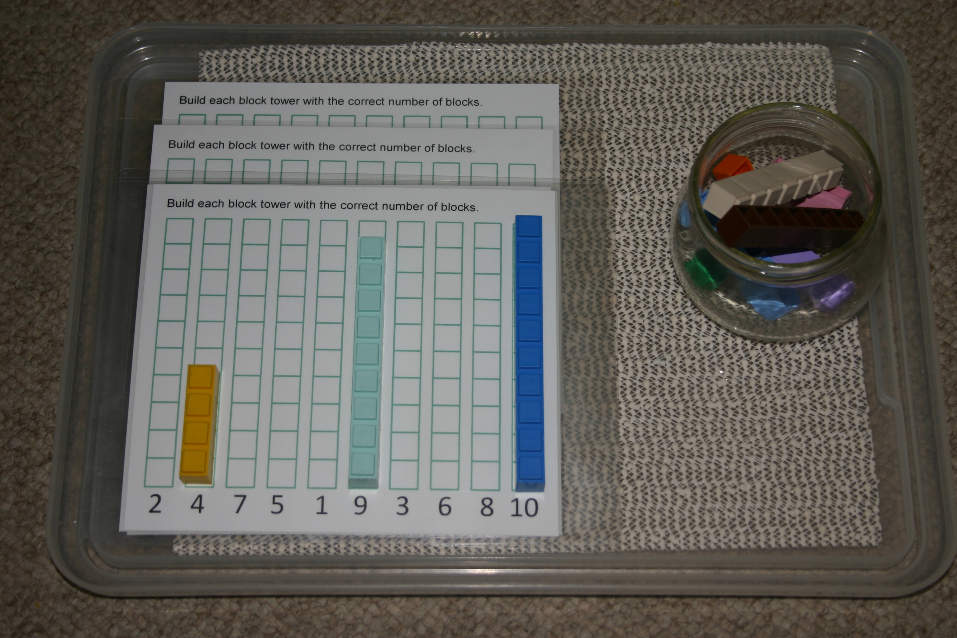 This is the same activity using a different style of block. These came from a build-your-own 3D desk calendar I bought for $1. You could also purchase Coko bricks which are almost identical and can be used on Duplo base boards. The twins have learnt to count to 30 out loud and have fairly good one-to-one correspondence so we are now working on recognising and sequencing numerals to 30.