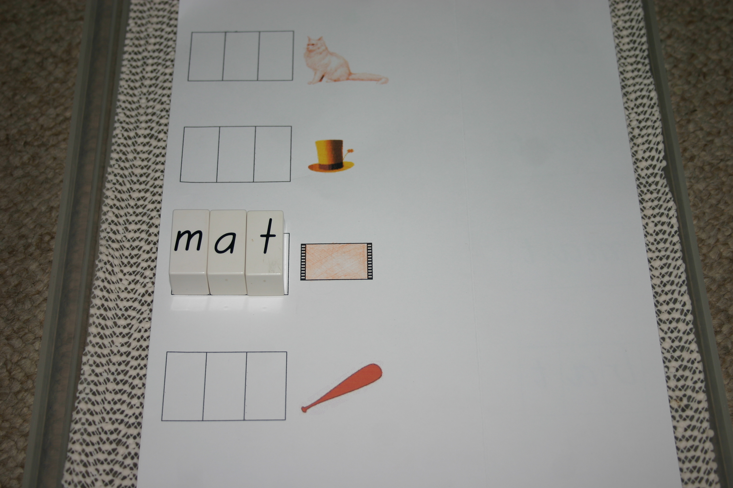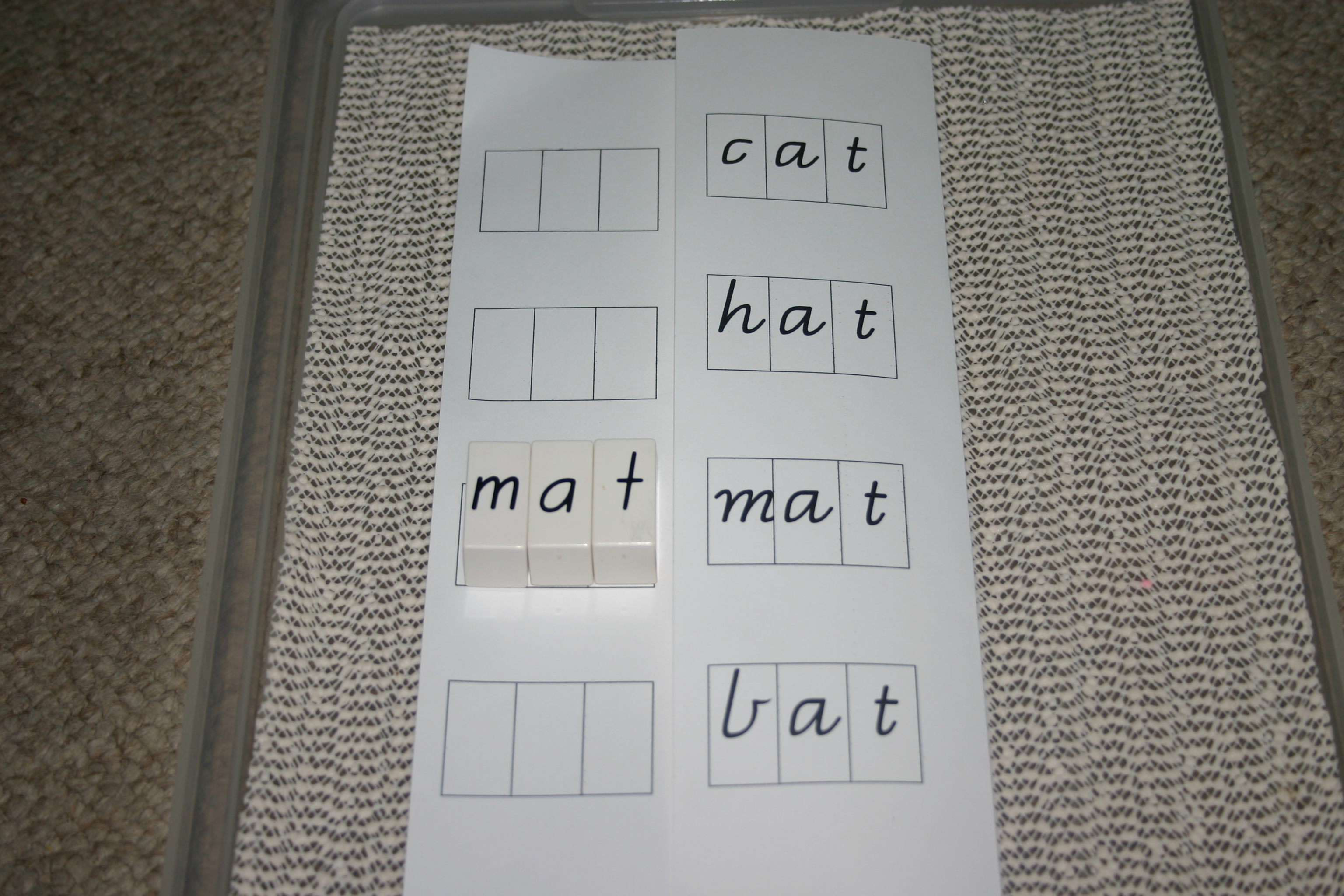 We have moved on from letter names and sounds and identifying initial sounds to 3 letter words. These are Coko bricks and each board has groups of consonant vowel consonant (CVC) words with the same endings to keep it simple. The children carefully sound out the words and find the matching bricks to make them.