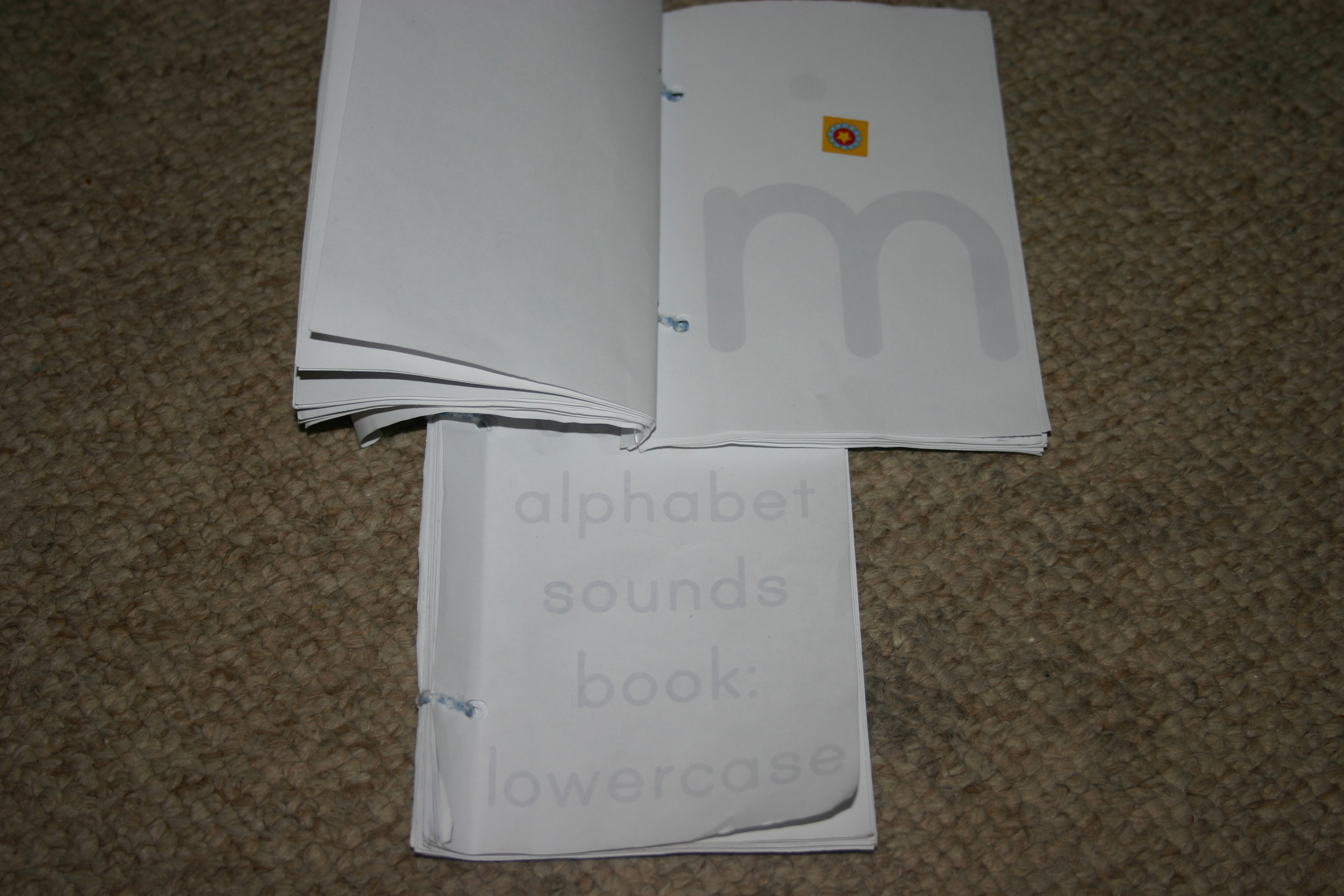 These alphabet sounds books were simply a book form of flashcard. We use them to review the letter names and sounds and sticker the letters they know. I found the school font I wanted to use online, enlarged it and printed them out.