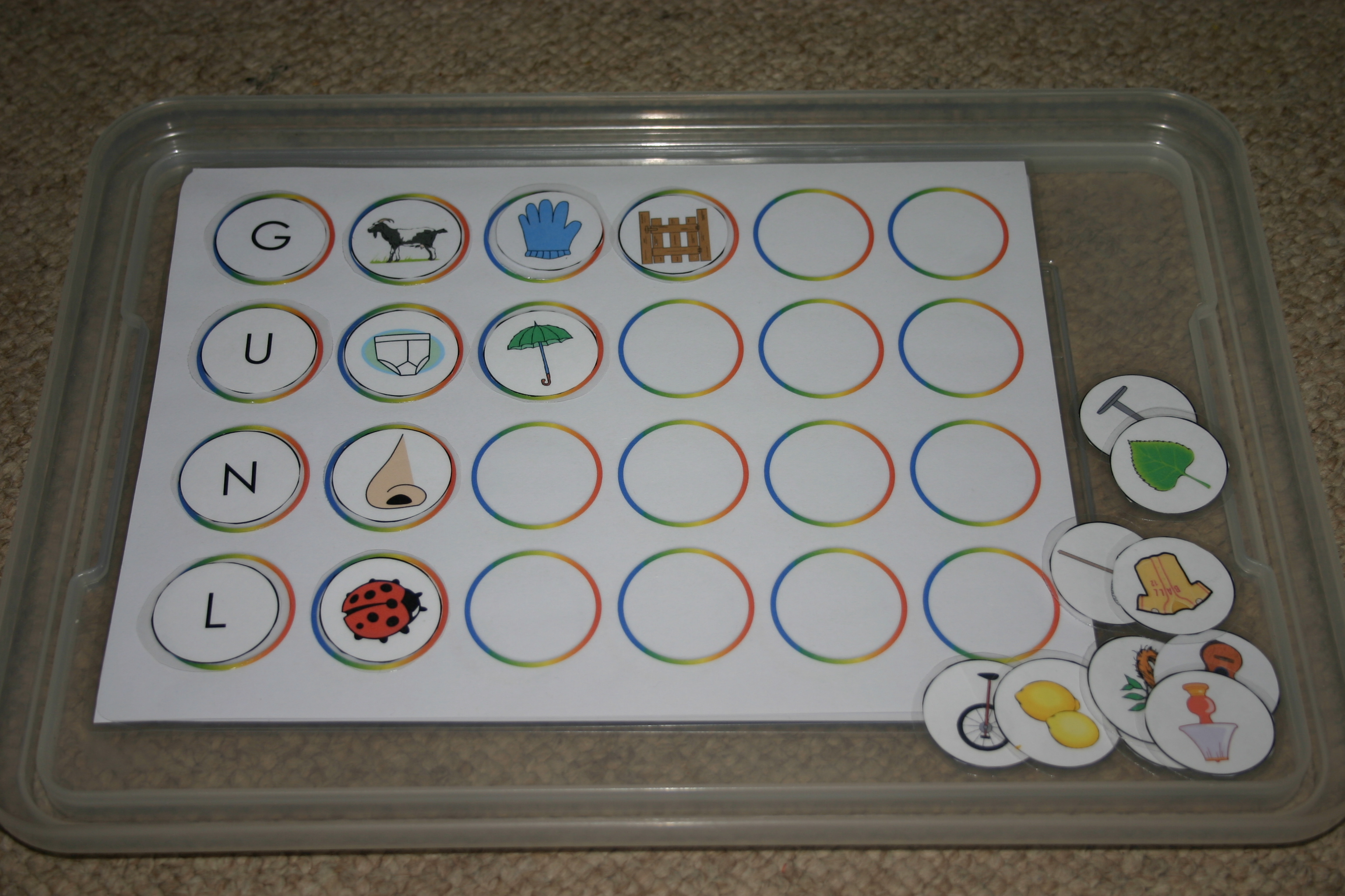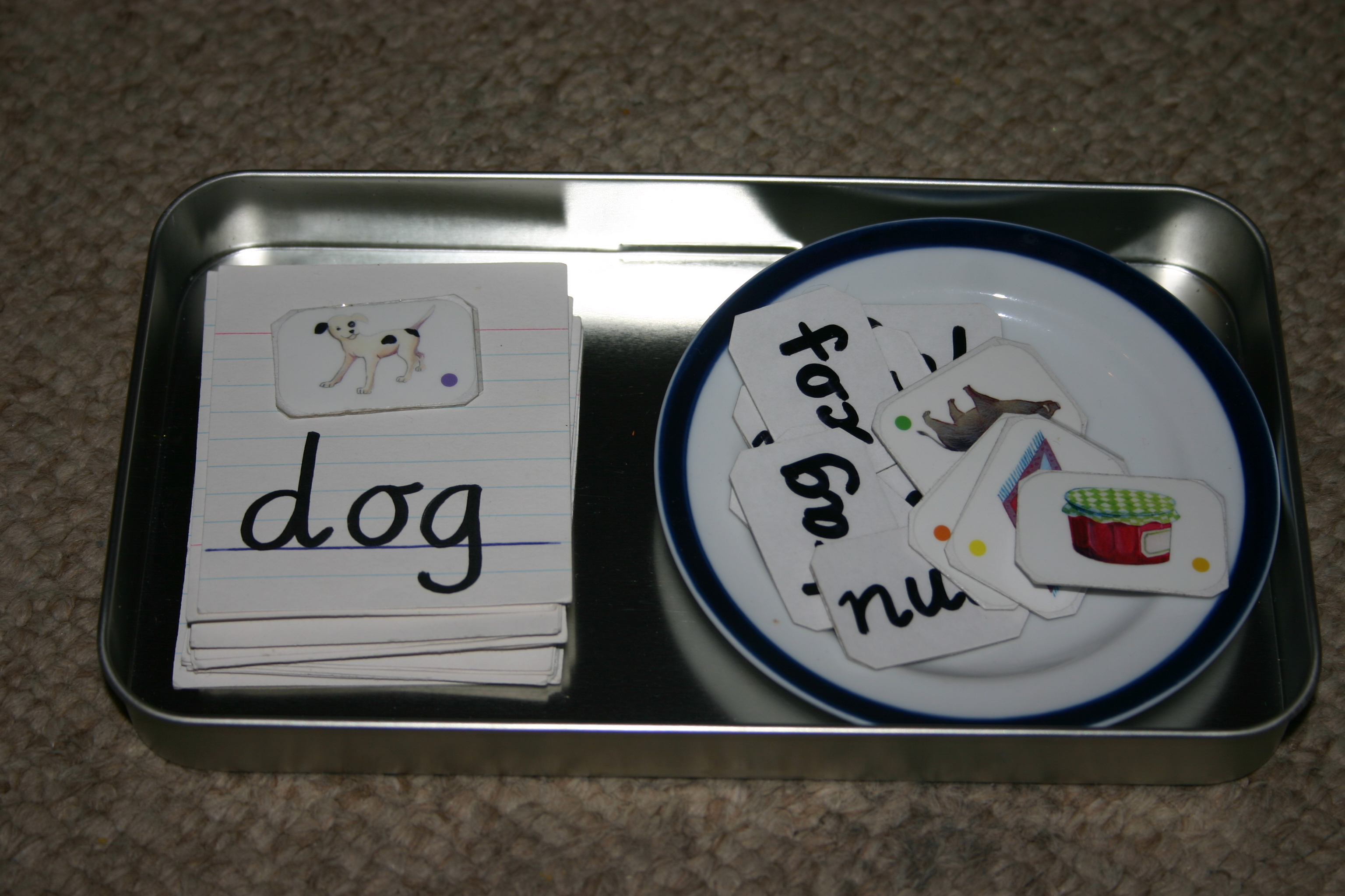 I made these consonant-vowel-consonant (CVC) 3 letter word matching cards using pictures from cheap sticker books. The children choose a picture and find the matching word card before turning the picture over to check their answer on the back.