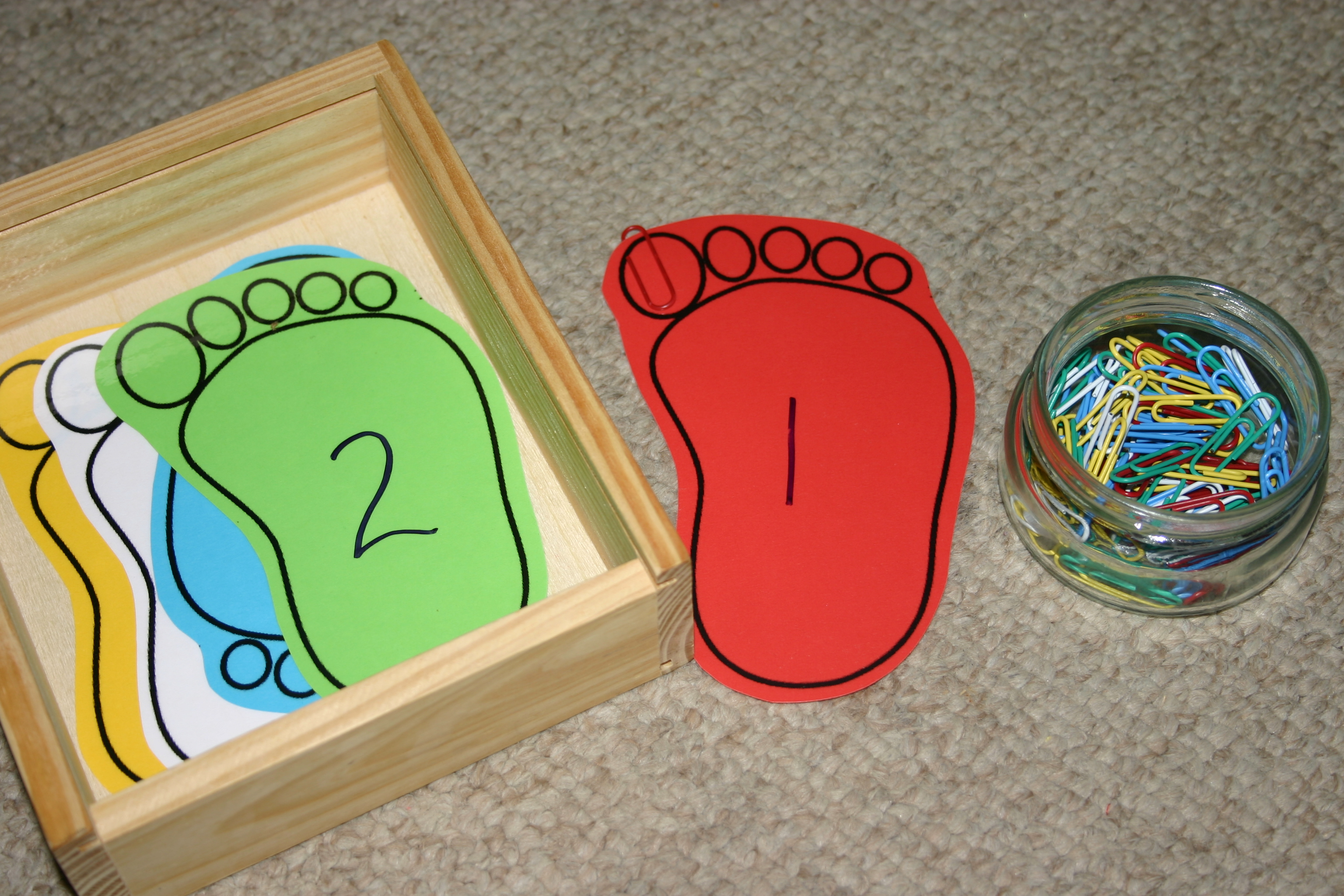 A basic counting and/or colour matching activity from an activity bag swap I posted on a while back. The concept is far too easy for the twins now but I wanted something for fine motor skills so popped this one out again. The idea is to slide the correct number of paperclips onto each foot after ordering the numerals from 1 to 5. You may also require them to match the colours at the same time.