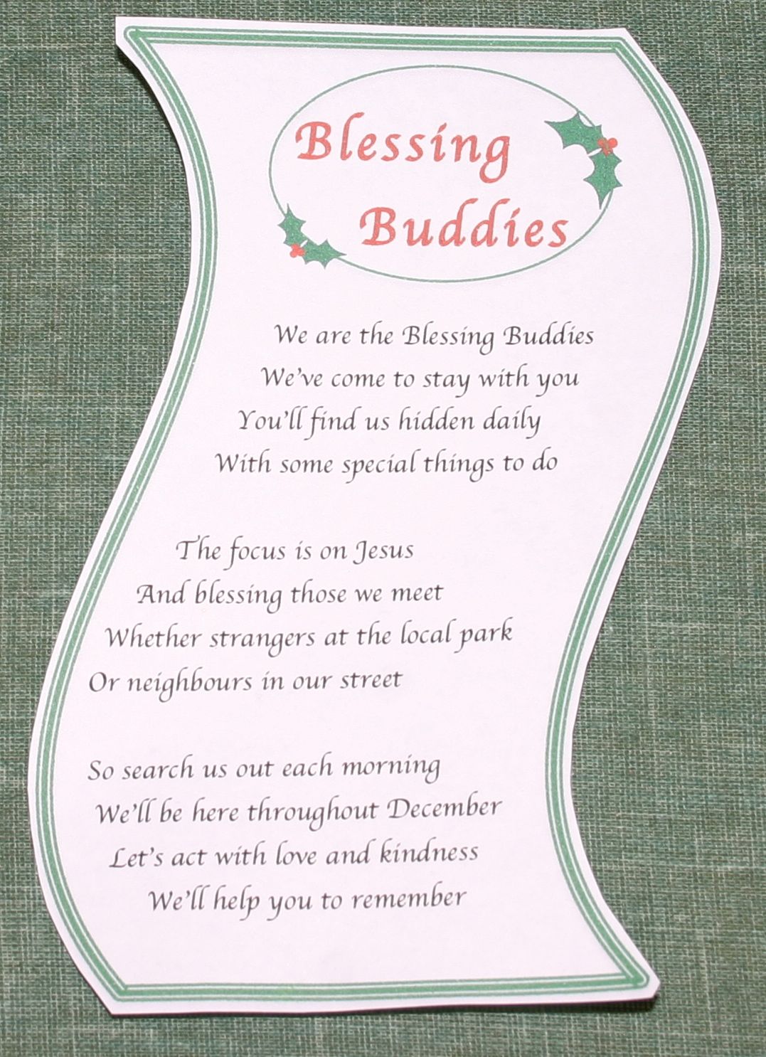 - Conduct a Christmas chocolate survey at your local shopping centre. Write down the name of the shop and ask the cashiers to tell you their favourite chocolate. Purchase their choices and slide them into decorated bags with a tract and card and tag of explanation. Deliver them back to the cashiers anonymously if possible. Pose the Blessing Buddies holding a partially eaten chocolate bar with a smudge of chocolate on their face, looking through junk mail catalogues or holding a pre-printed survey page with a bunch of cut out bag tag poems of explanation (I have printables.) Have the Blessing Buddies favourites already written onto the survey page.