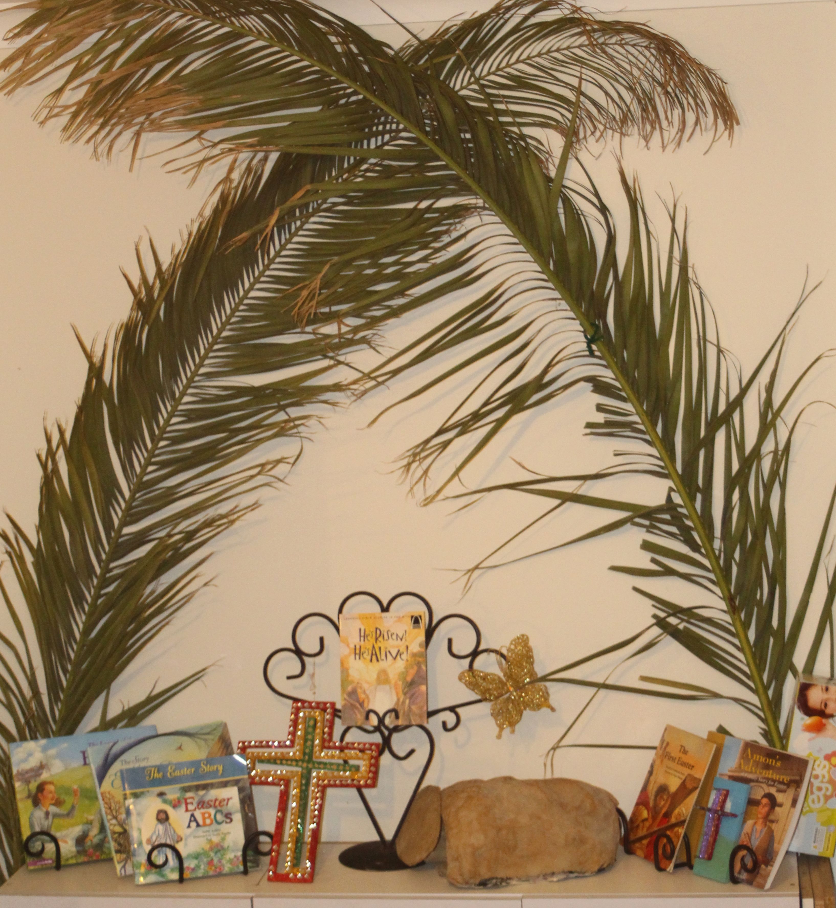 Our Easter space with books and objects that help direct our attention to the real meaning of this season. We used palm branches to act out the story of Jesus’ entry into Jerusalem. The kids threw down blankets as cloaks as well as the branches and made crowd noises to help tell the story. It was a little chaotic but lots of fun.