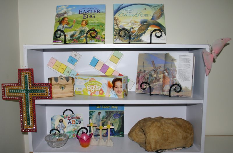 Decorations: We decorate for Christmas, why not Easter? We have started a selection of symbols, books and Easter resources that we use to make a display leading up to the Easter period. This year we are making a living Easter centrepiece that I found here: http://mustardseeds.typepad.com/my_weblog/2010/03/tutorial-hill-of-calvary.html