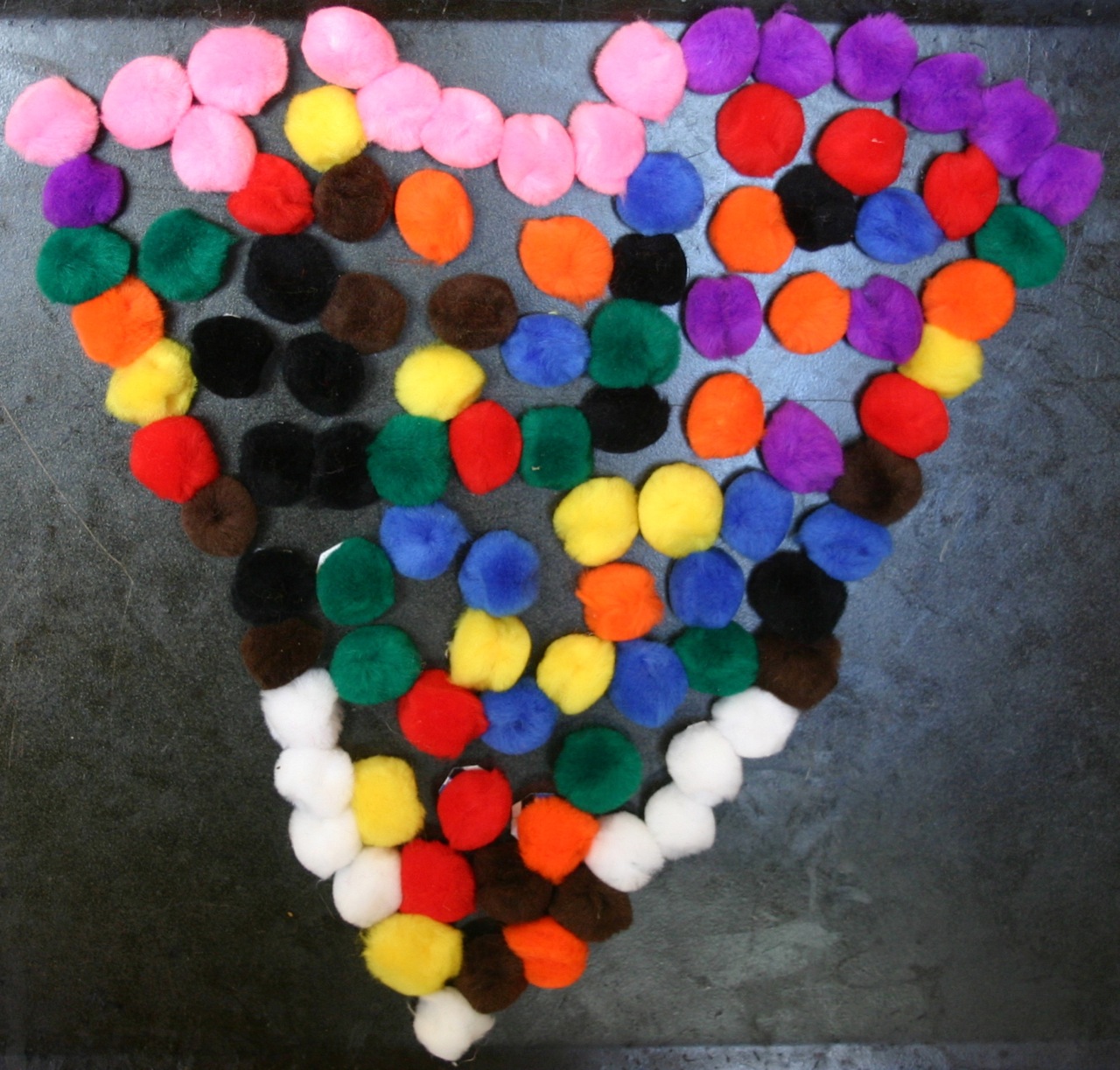 My original plan was to use them with the multitude of “do-a-dot” pictures that can be found on the internet, so I printed out a stack and laminated them for durability. (These pictures have circles all over them that you can dot with bingo markers or stick on small stickers for a fine motor activity.) The fridge magnets however are not strong enough to hold the pompom on to the surface through the laminate so I am going to make a second set with stronger magnets for that purpose and leave these for free creating. pompom heart IMG_8284