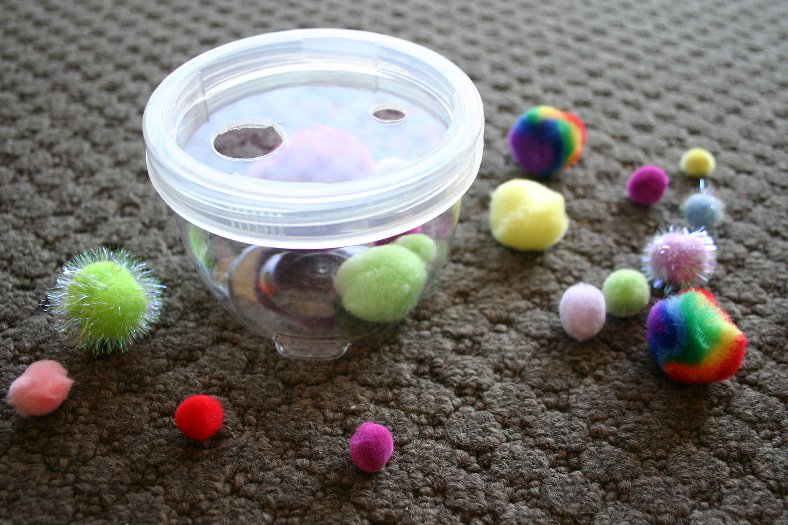 Pop-pom push jar. Push the pompoms through 2 sizes of holes into the plastic container. (Tip: Use a drill to make the holes.)