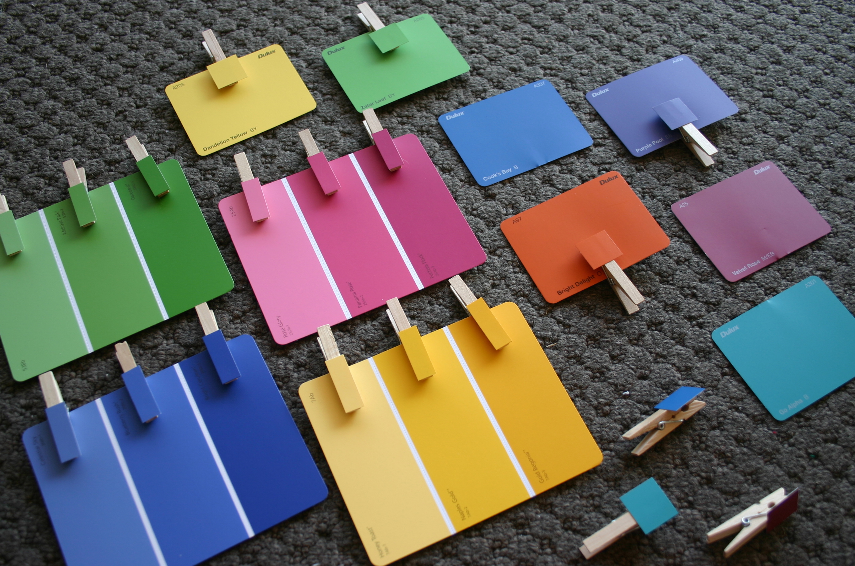 Paint swatch pegging. Pincer grip (necessary for writing later) is exercised by opening the pegs to match them to the correct colour swatch.