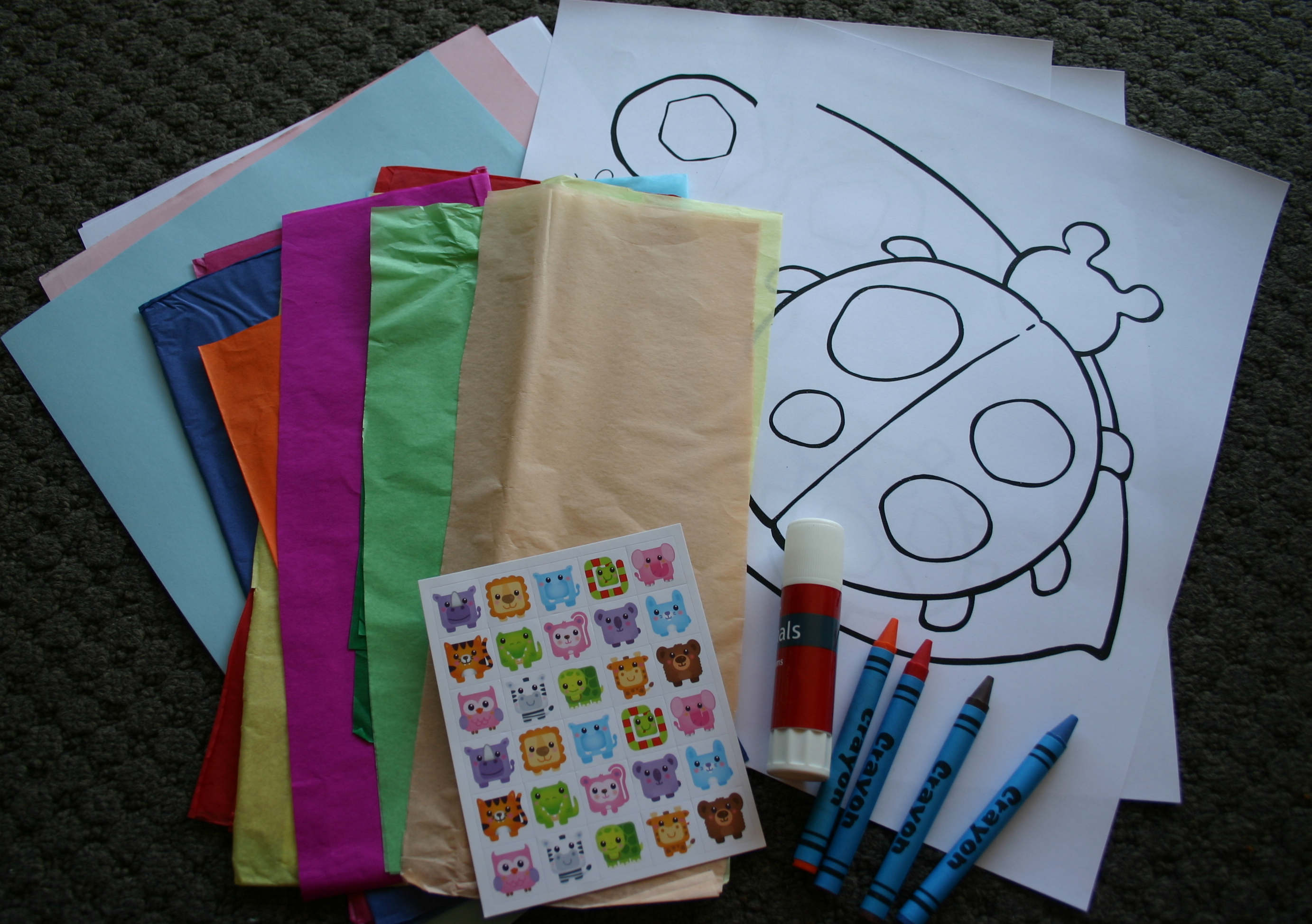 Tissue paper pictures. Tear pieces of tissue or crumple into balls to decorate the pictures or make you own with the blank paper and glue. Stickers and crayons are added for extra fun as well.