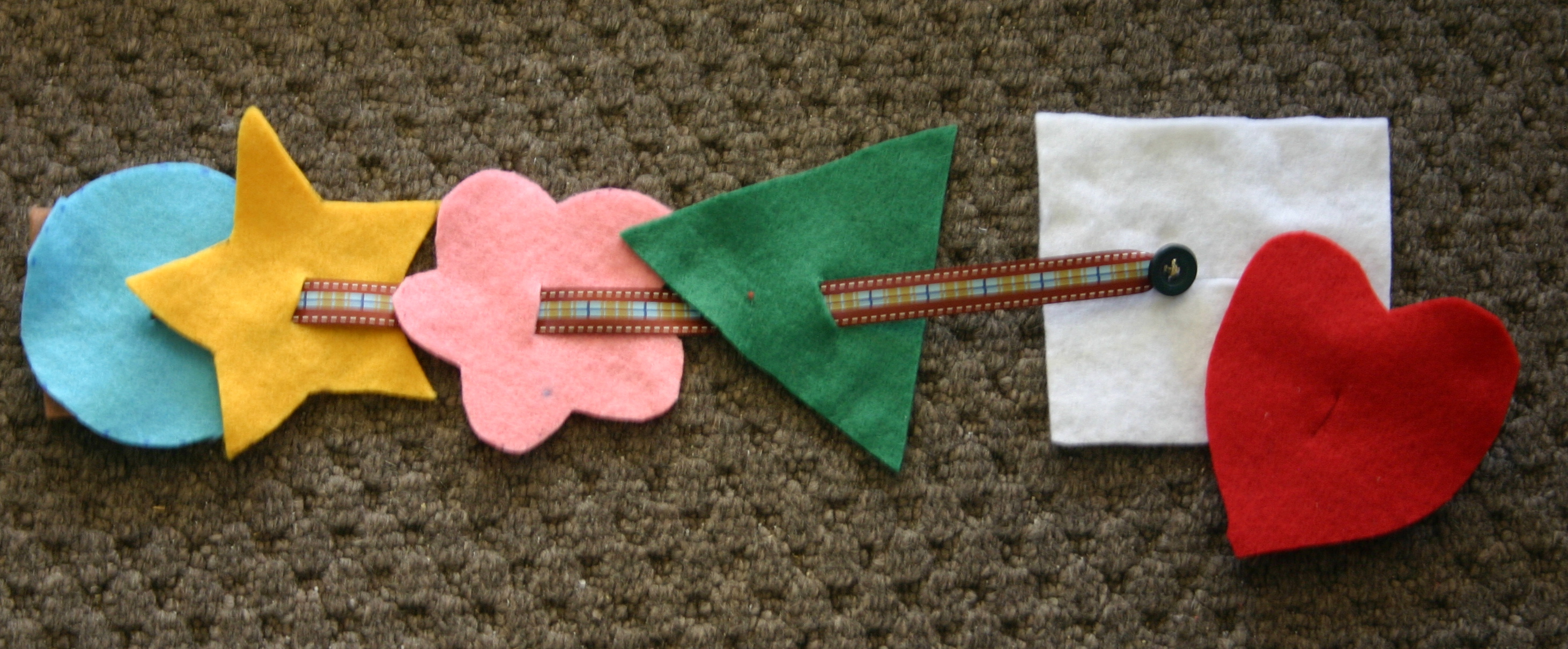 Button snake. Great for learning how to do up buttons; excellent for fine motor control. The felt pieces are pushed on and off the “snake” using the button head.