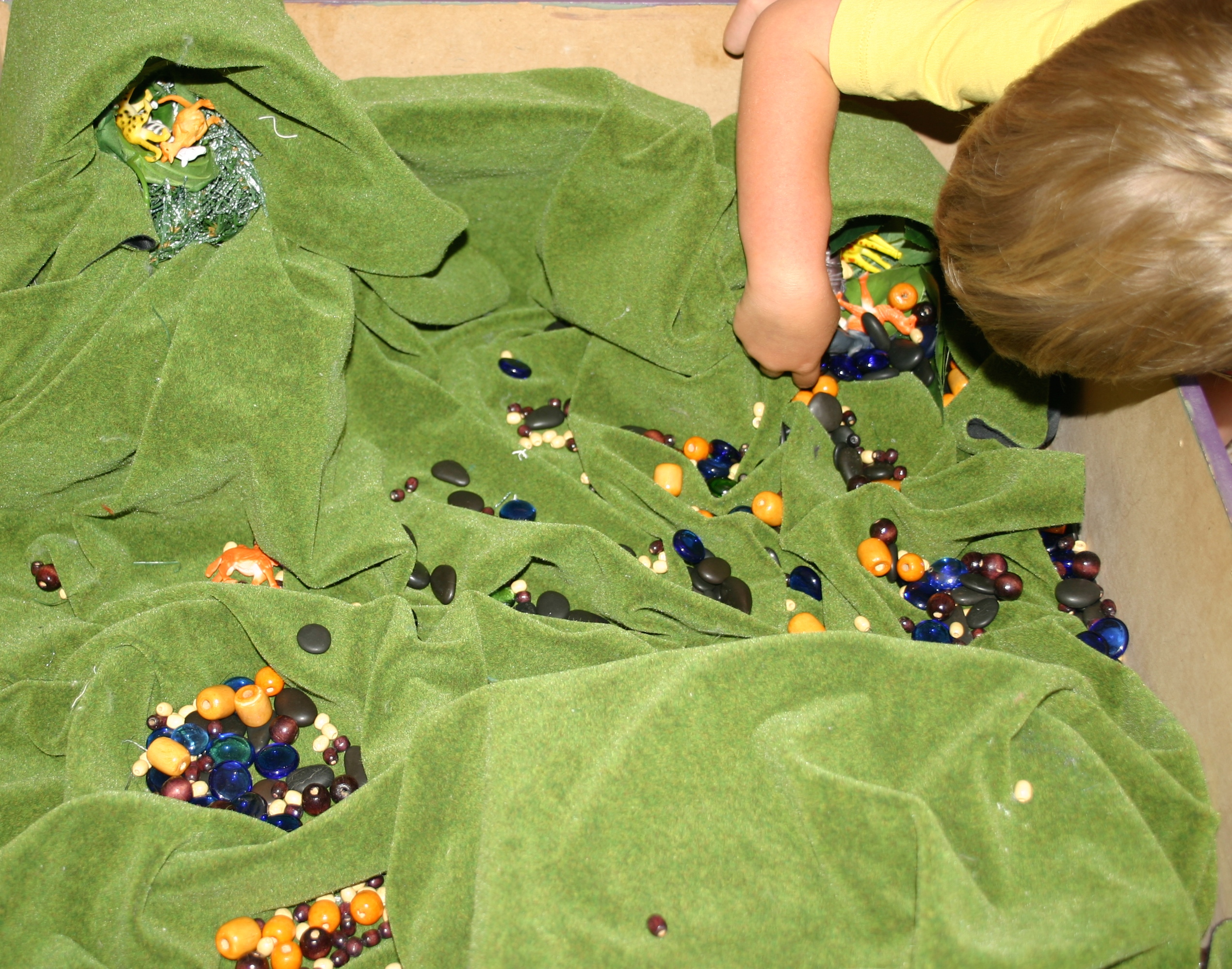 You could easily change this idea to a different environment with a different coloured sheet – white for snow, yellow for desert etc. and add the appropriate animals and accessories.