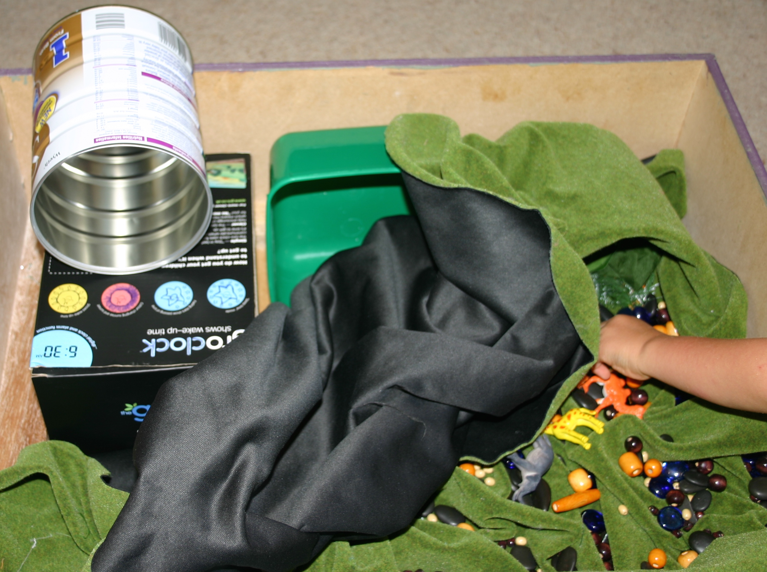 We started with a bunch of tins and boxes for caves and hills and draped a green cloth over the top .