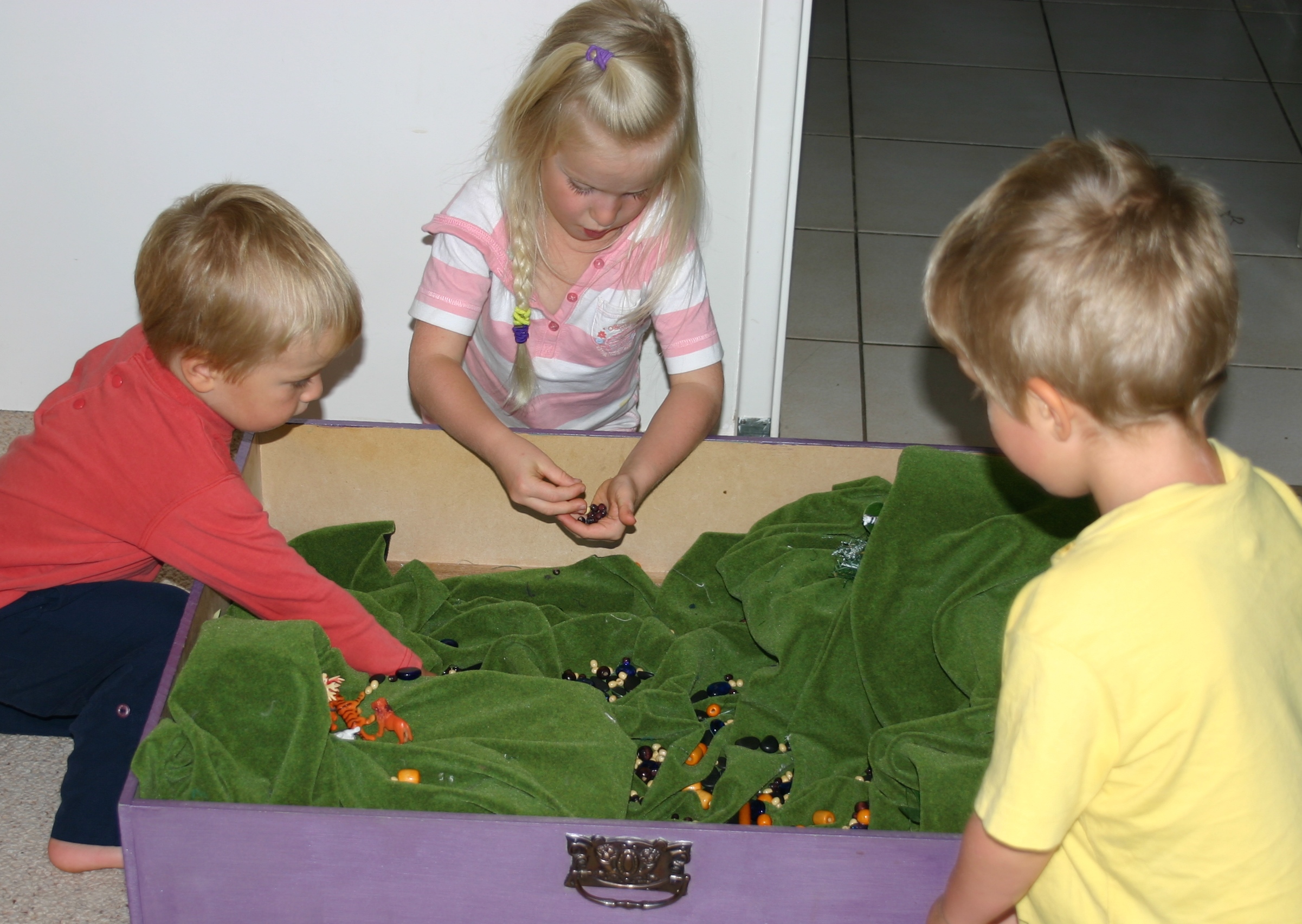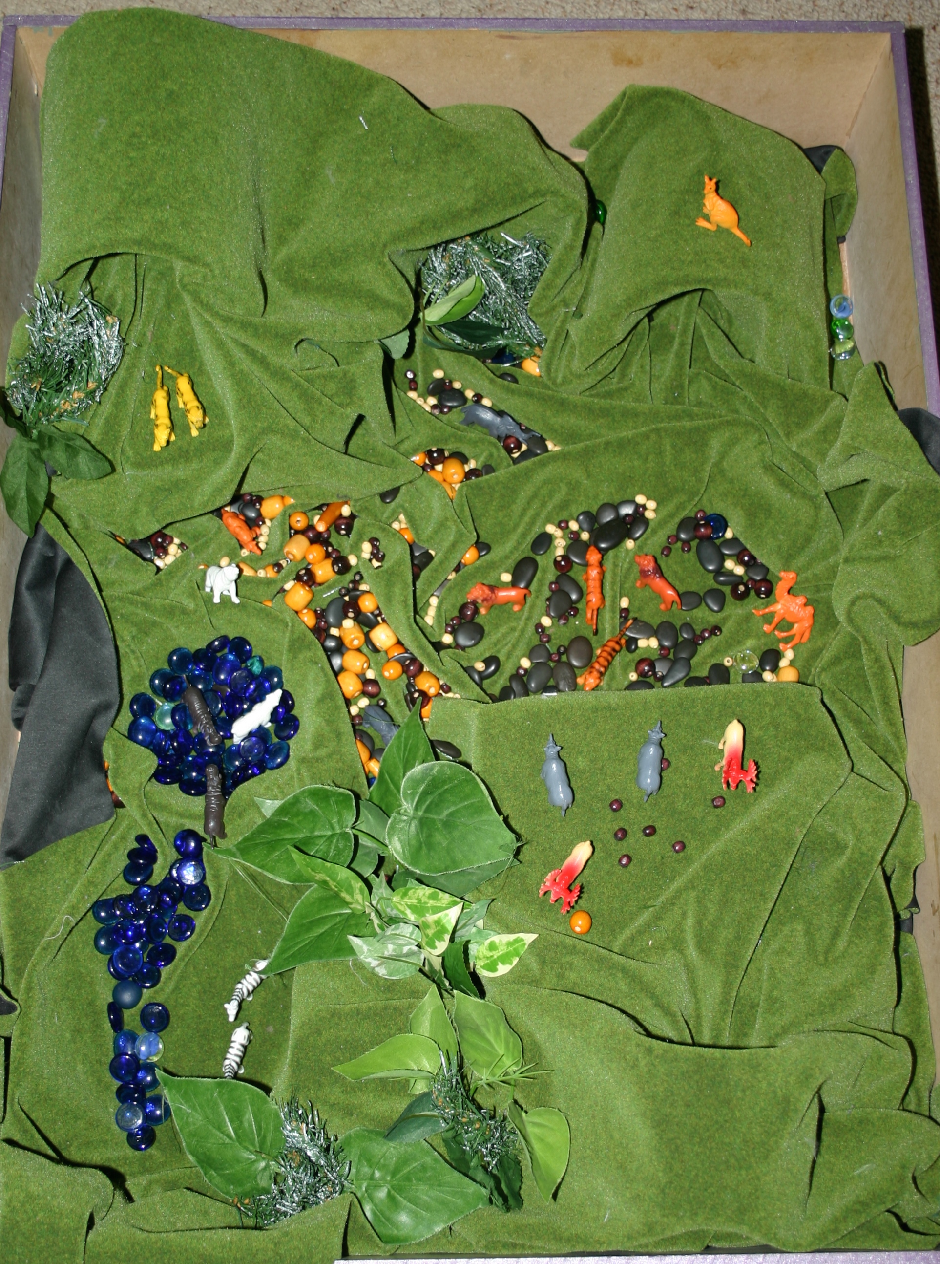 To our basic landscape we added artificial leaves for trees (old Christmas tree branches work well for this), blue jewels for water, black stones and a bunch of assorted wooden beads – and of course the animals.