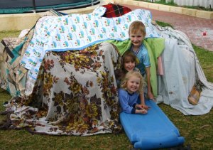 Sheet tents, cubbies and camping games Get out the sleeping bags, pillows, sheets, doonas, suitcases, backpacks, bags and torches and clean off the table for some fun tent making. Couch cushions and lounges also work well, as do chairs. Once the camping area is set up, packing the bags with tonnes of camping necessities will keep them occupied for quite a while. If you have real camping items like billies, folding chairs, 2 man tents etc. let the kids incorporate these into their games. Of course the next question will be “Can we sleep in our tent tonight Mum?”