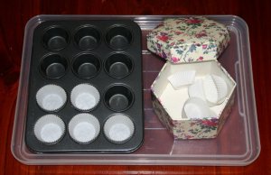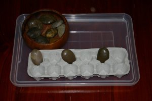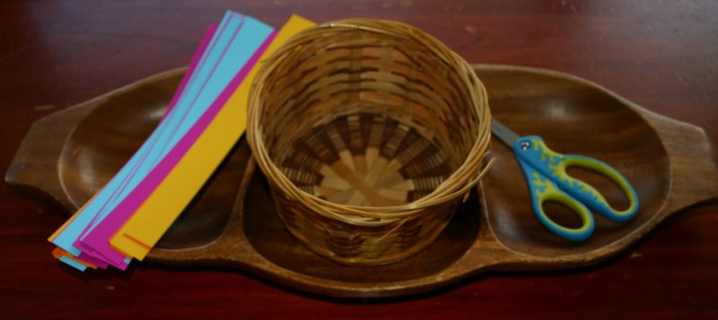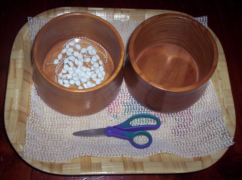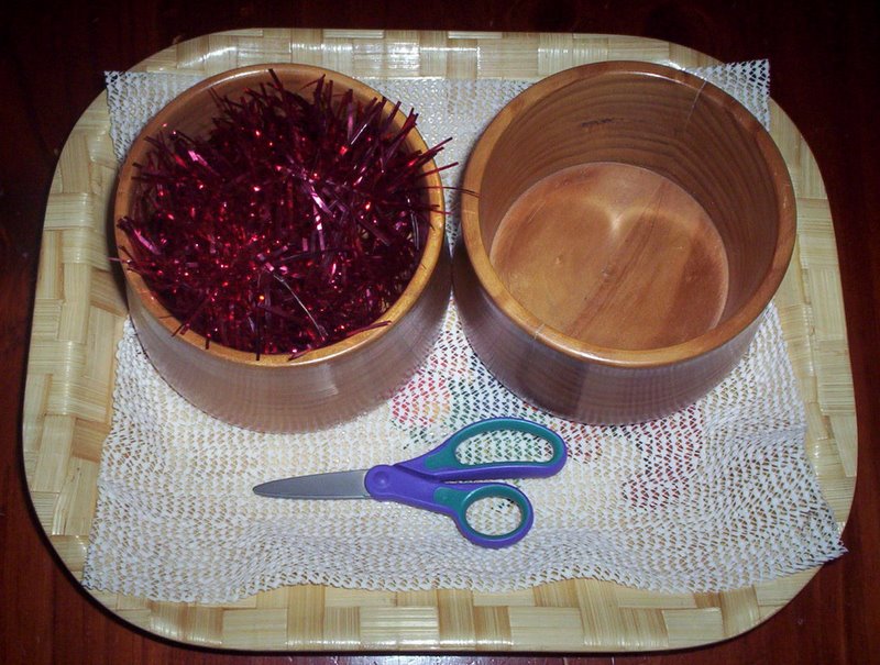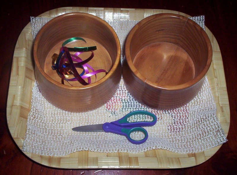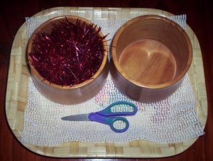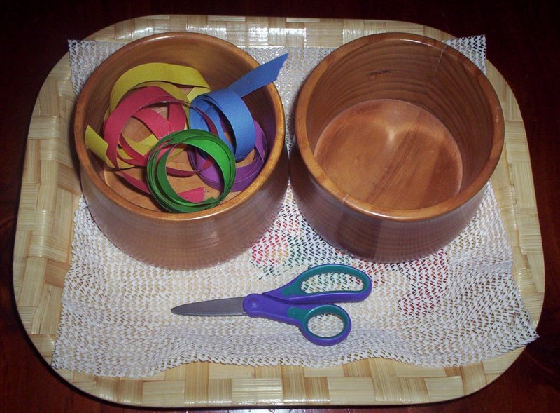 I usually set my cutting activities up in the same format (same tray with basket or two wooden bowls) so that once familiar with the task, there is no need to re-explain what to do when a new material is introduced. Scraps are caught in the empty bowl or basket and can be collected and used for art activities such as gluing or collage.